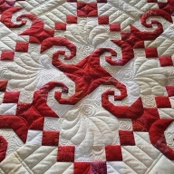 Beth’s springtime quilt, done shortly before the stay at home order, has digital design African Maze by Anne Bright on it. A light green Omni thread and Hobbs 80/20 batt.